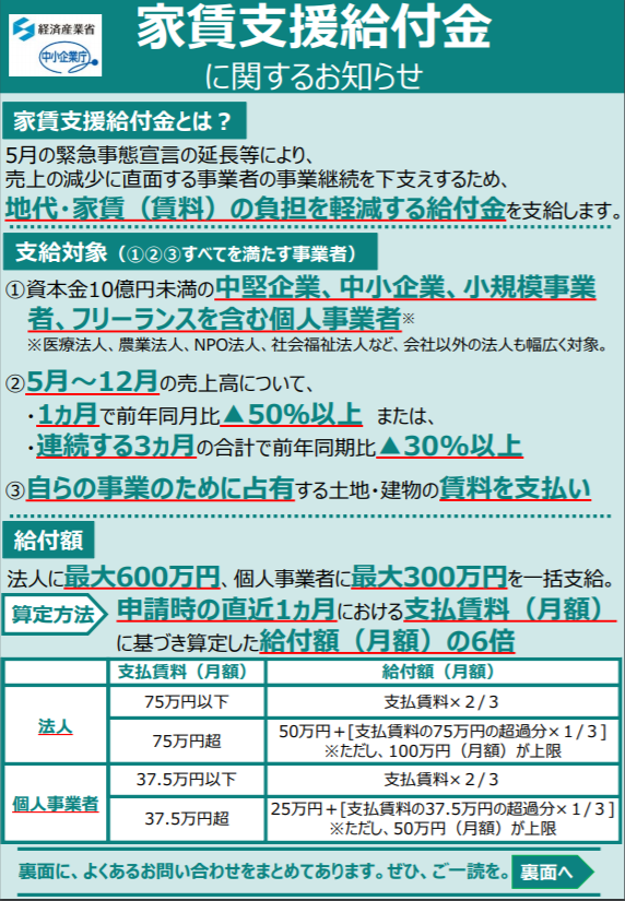 5月の緊急事態宣言の延長等により、売上の減少に直面する事業者の事業継続を下支えするため、地代・家賃(賃料)の負担を軽減する給付金が支給されます。