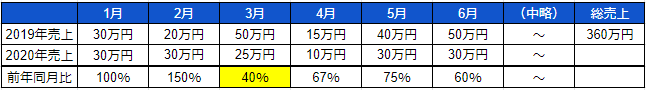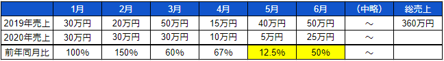 この場合、50%以上減少している5月・6月のうち、売上が少ない5月を選択し、計算します。