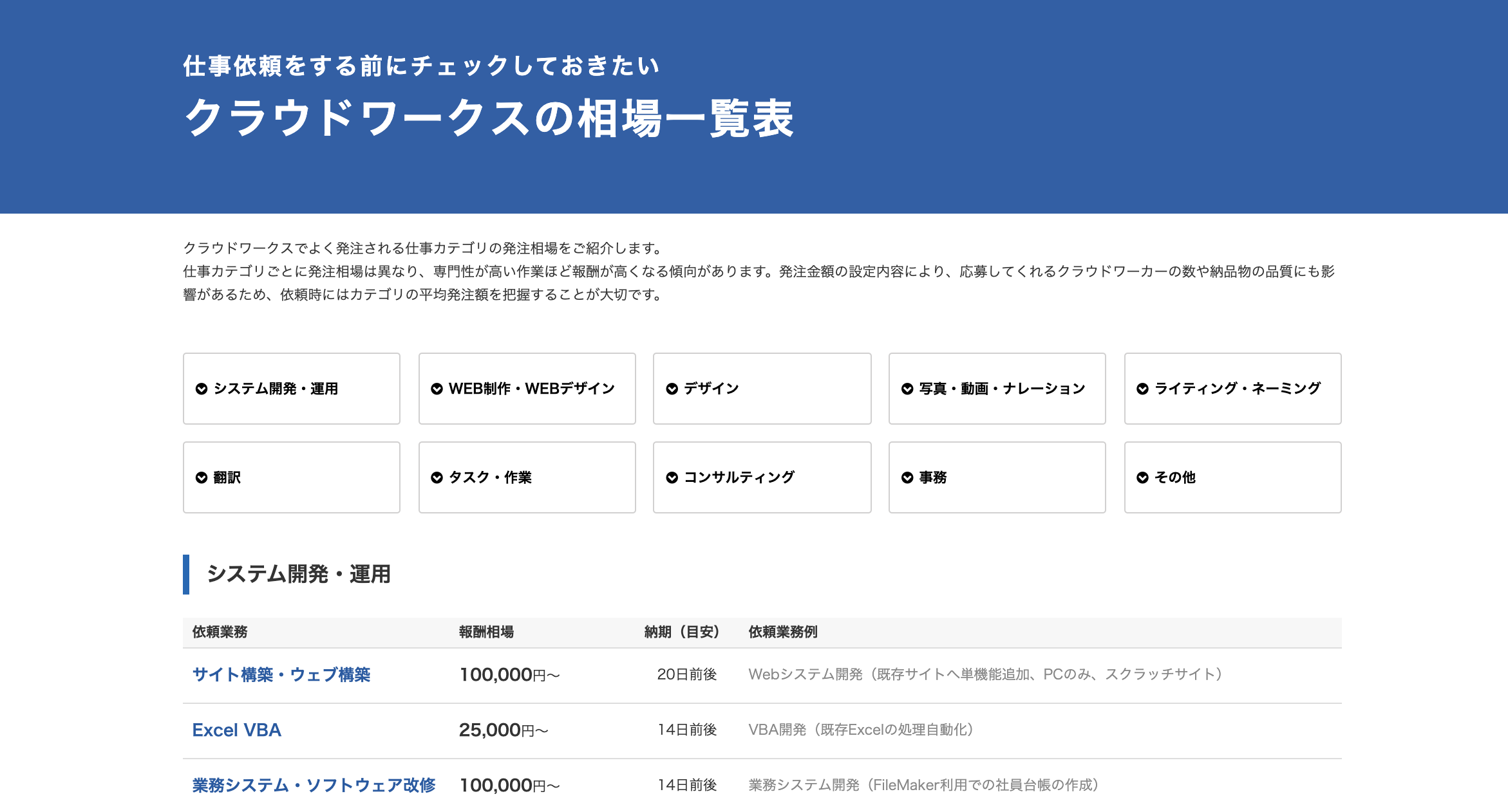 また、クラウドワークスでよく発注される仕事カテゴリの発注相場一覧表をサービス上に掲載いたしました。
