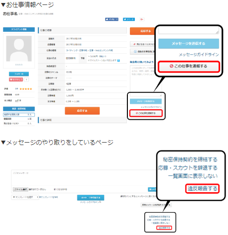 上記のような仕事依頼ガイドラインや利用規約に反した業務内容を依頼された、仕事を発見した場合は、「この仕事を通報する」または「違反報告をする」より事務局までお知らせください。