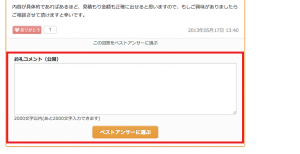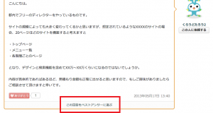 相談者は自分の相談ページから「この回答をベストアンサーに選ぶ」をクリックすると、お礼コメントと共に、最も参考になった回答をベストアンサーとして選ぶことができます。