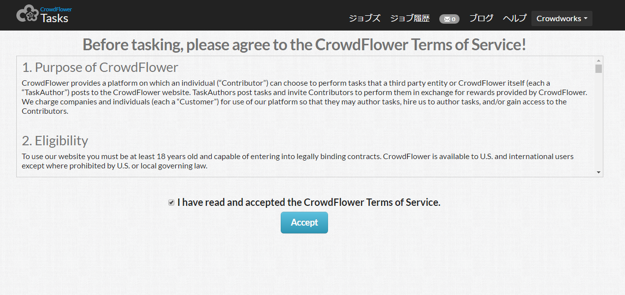 7. CrowdFlowerの画面に遷移し、利用規約が表示される