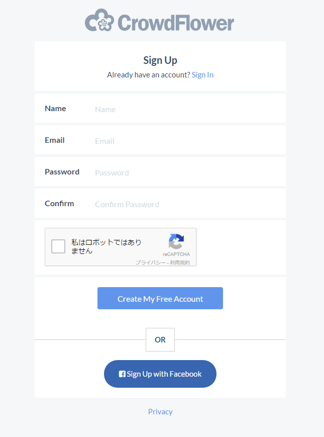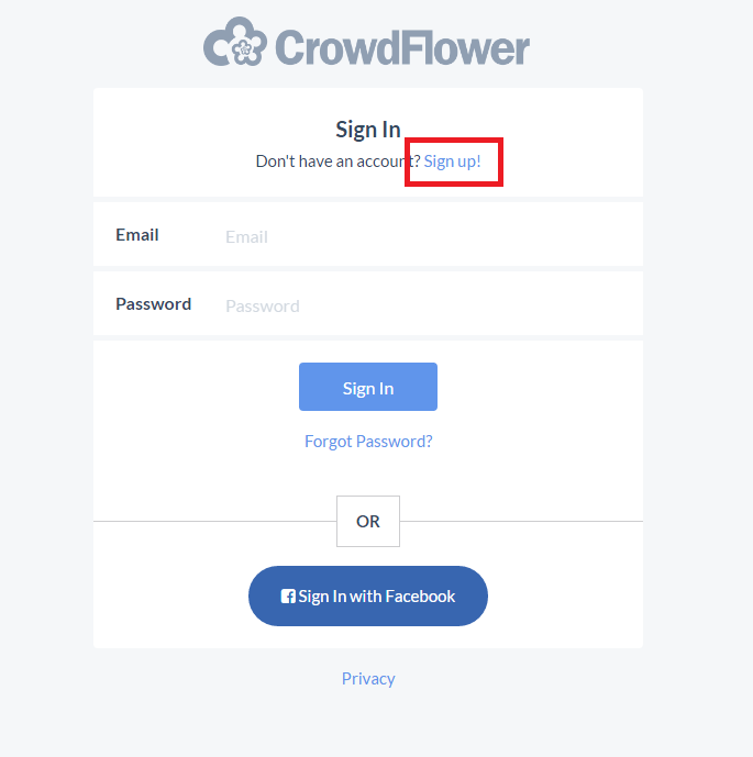 2. CrowdFlowerに遷移後、「Sign up!」を選択する