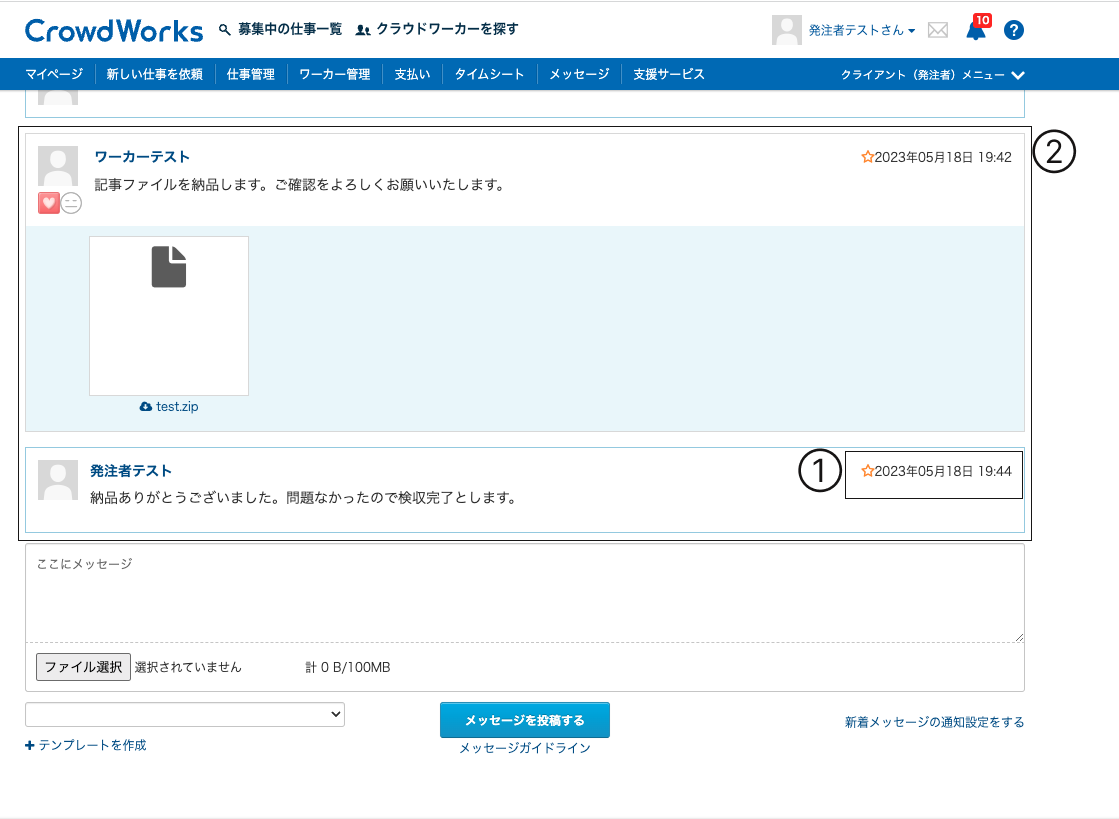今回の変更により、メッセージ画面で「from クライアント」「fromワーカー」を切り替えると、該当のメッセージが絞り込まれて一覧表示されます。