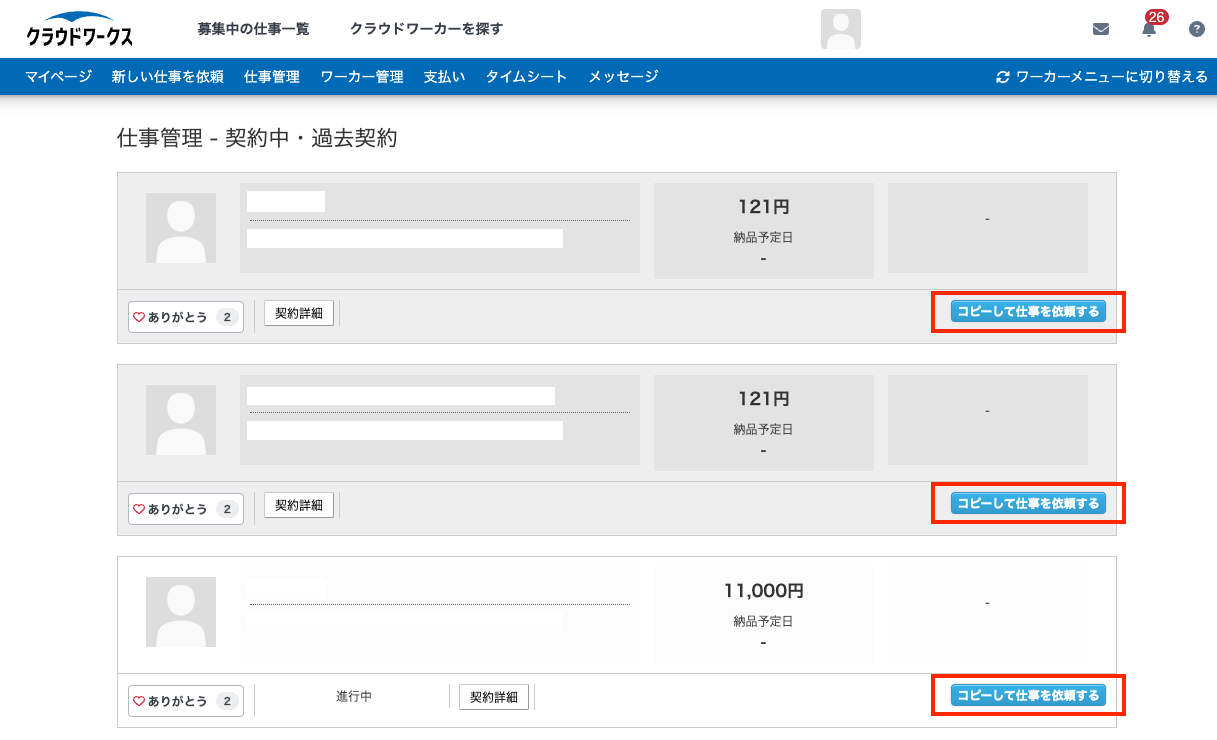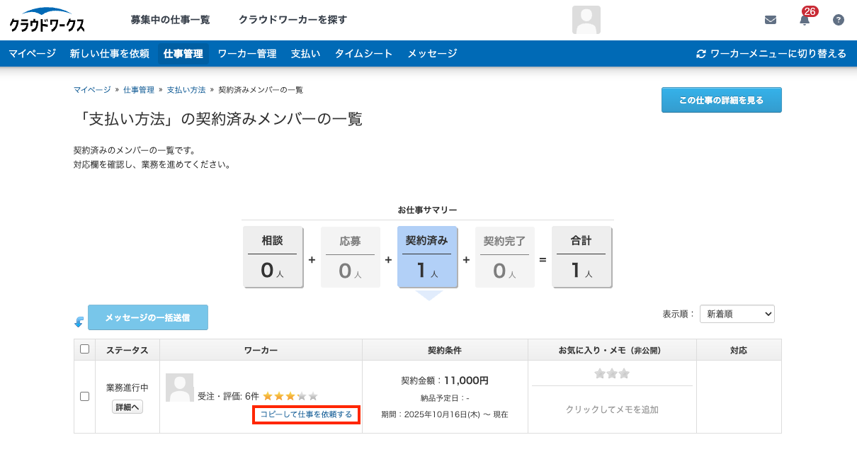 遷移方法:ダッシュボード > 仕事管理 > 複製したい仕事の「契約済み」もしくは「契約完了」 > ワーカーとの契約詳細